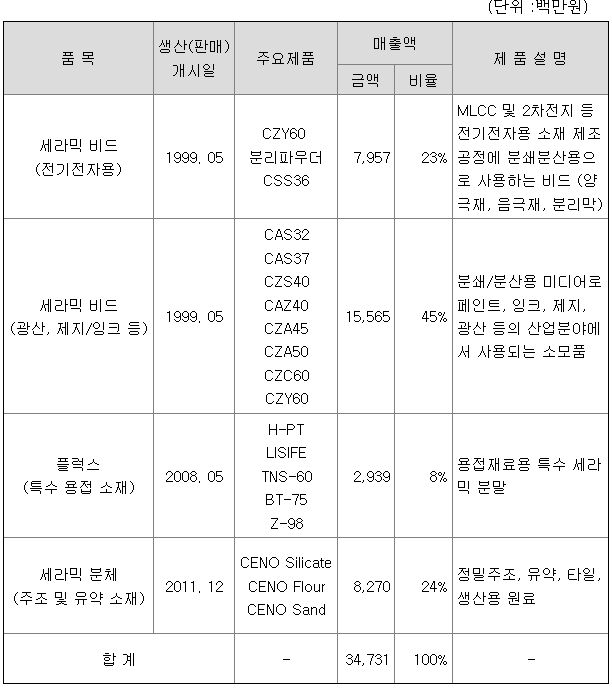 국내 최초로 세라믹 비드 양산화에 성공하여 특화된 비드를 전문 생산하는 당사는 분쇄/분산용 세라믹 비드 사업부(비드 사업부), 용접재료용 플럭스 사업부(플럭스 사업부) 및 분체 사업부로 구성되어 제품을 생산 판매하고 있습니다. 또한 2022년부터 촉매코팅용 세라믹 담체 사업부를 신설하여 전량 수입에 의존해오던 화학 공정의 촉매 제조용 세라믹 담체를 양산화하고 있으며, 2023년부터 제품화하여 공급 확대 예정입니다.