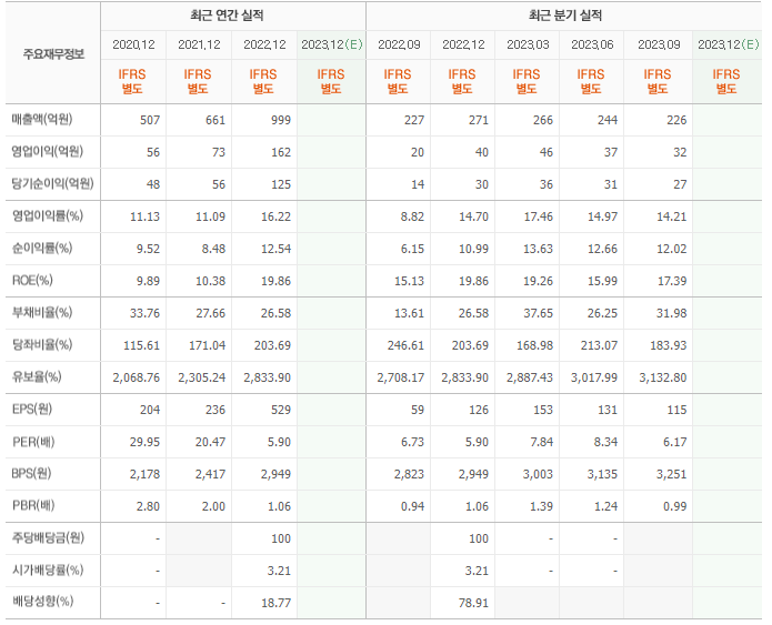 2022년 매출은 999억, 영업이익은 162억, 당기순이익은 125억입니다. 그리고 영업이익률은 16.22%입니다.
