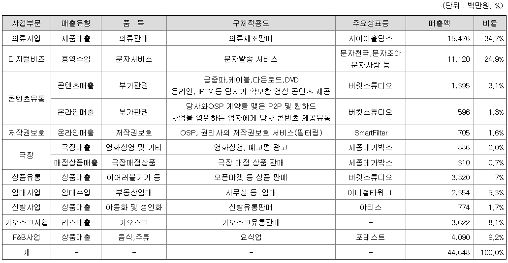 당사는 IPTV, 케이블방송, 스마트TV, 태블릿 등 스마트 기기 기반을 중심으로 영화, 영상, 교육 등의 콘텐츠 제공 및 온라인 콘텐츠유통의 필수 기술인 필터링 솔루션을 통한 사업, 모바일 서비스(대량문자 발송 및 벨소리 다운로드 서비스)와 5G 주변 기기(이어러블 등) 유통사업 및 온라인 기반의 라이브 커머스(컨설팅, 대행, 방송, 판매 등) 사업 및 임대사업을 영위하고 있으며, 당사의 주요 종속회사는 키오스크 유통 사업과 신발 제조 및 판매를 주사업으로 영위하고 있으며, 신규사업으로 F&B사업에 진출하였습니다.