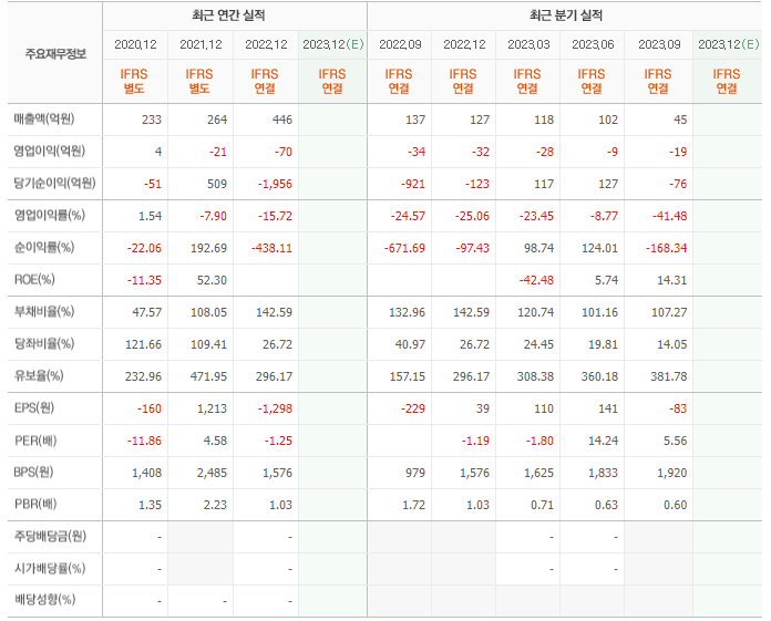 2022년 매출은 446억, 영업이익은 -70억, 당기순이익은 -1956억입니다. 그리고 영업이익률은 -15.72%입니다.