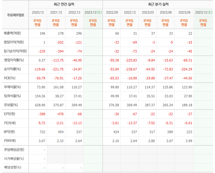 2022년 매출은 296억, 영업이익은 -121억, 당기순이익은 -74억입니다. 그리고 영업이익률은 -40.95%입니다.