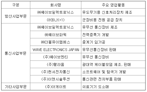 당사 및 종속회사는 국가 방위를  위한 군사용 무기 생산과 개발에 기여하는 방위사업과  유무선통신 장비를 제조 및 판매하는 통신사업 등을 영위하고 있습니다