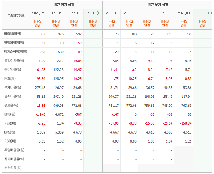 2022년 매출은 592억, 영업이익은 -59억, 당기순이익은 -89억입니다. 그리고 영업이익률은 -10.03%입니다.