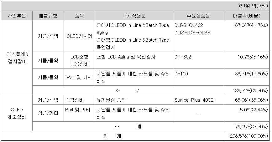 당사는 수익을 창출하는 재화와 용역의 성격, 이익창출의 단위, 제품 및 제조공정의 특징 및 시장의 특성을 고려하여 디스플레이검사장비부문과 OLED제조장비부문 및 신기술사업금융업부문 으로 사업을 구분하고 있습니다.
