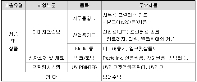 사무용 프린터 잉크, 산업용 프린터 잉크, 전자소재 및 재료 사업의 Paste Ink, 절연필름 및 EMI 차폐필름, 인덕터 등과 UV잉크젯경화프린터인 JETRIX를 생산·판매하고 있으며, 미디어용지, 잉크젯상품 등과 같은 상품을 판매하고 있습니다.