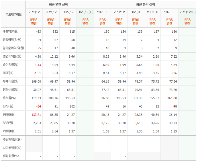 2022년 매출은 615억, 영업이익은 58억, 당기순이익은 40억입니다. 그리고 영업이익률은 9.46%입니다.