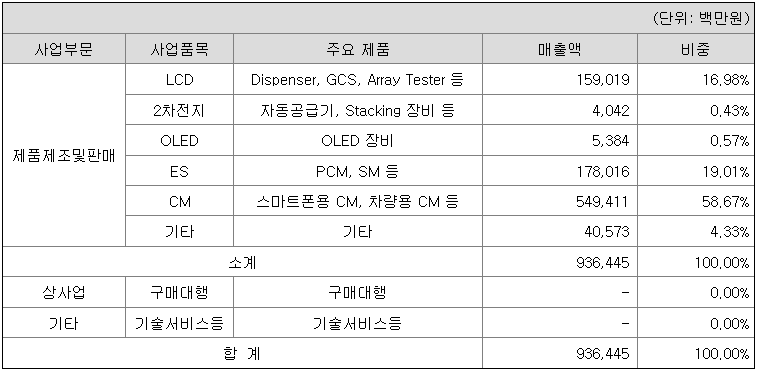 당사는 TFT-LCD, OLED 패널 및 2차전지, 카메라모듈 공정장비 제조 및 판매를 주된 사업으로 영위하고 있으며, 계열 회사를 통해 부품 및 신소재 관련 제품 등으로 사업영역을 확장하고 있습니다.
