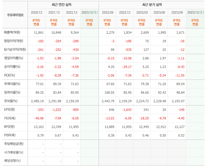 2022년 매출은 9364억, 영업이익은 -285억, 당기순이익은 -430억입니다. 그리고 영업이익률은 -3.04%입니다.
