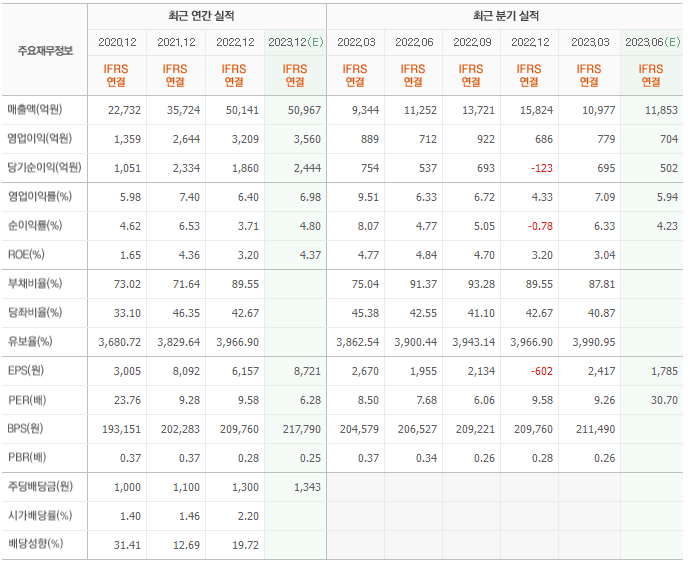 2023년 예상 실적은 5조 967억, 영업이익은 3560억입니다. 그리고 영업이익률은 6.40%입니다.