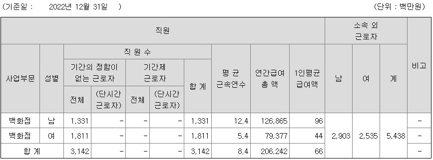 | 사업부문 | 성별 | 직원수 | 평균근속연수 | 평균연봉(백만) |