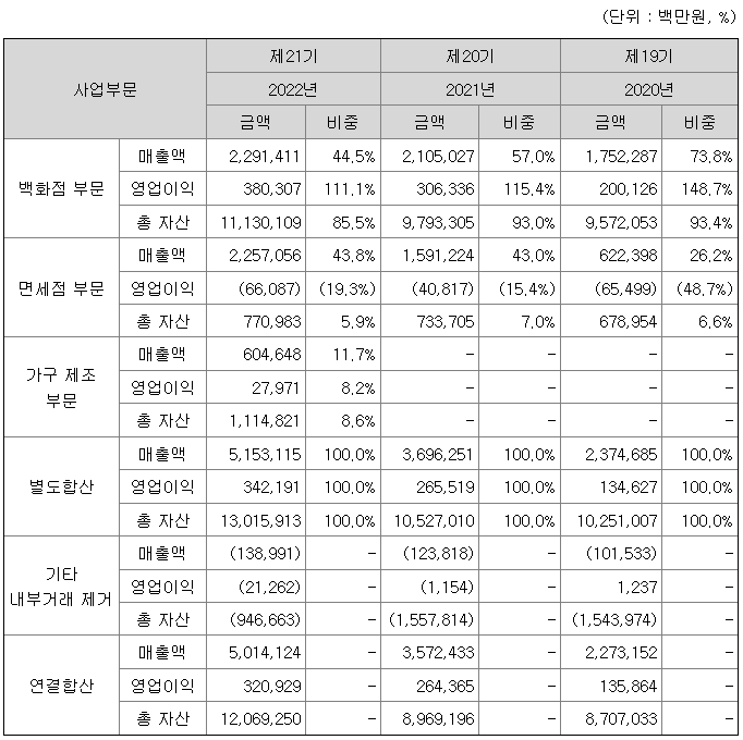 지배회사와 종속회사는 영업부문에 대한 구분시 기업회계기준서 1108호에 따른 통합기준 및 양적기준을 고려하였으며, 수익을 창출하는 재화와 용역의 성격, 시장 및 판매방법의 특징, 사업의 계속성 등을 고려한 영업부문별 경영성과를 적절히 반영할 수 있도록 백화점 부문, 면세점 부문, 가구 제조 부문으로 세분화 하였습니다.