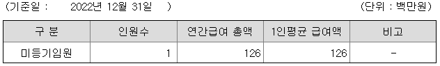 미등기임원의 평균연봉은 1억 2600만원이고 직원수는 1명입니다.