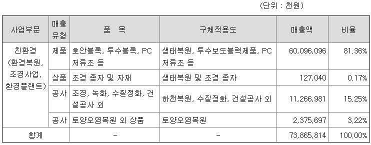 ○ 지배회사인 당사의 주된사업은 환경생태복원사업, 토양정화사업, PC저류조사업, 기타 건축공사업 등을 영위하고 있으며 사업의 개요는 다음과 같습니다.