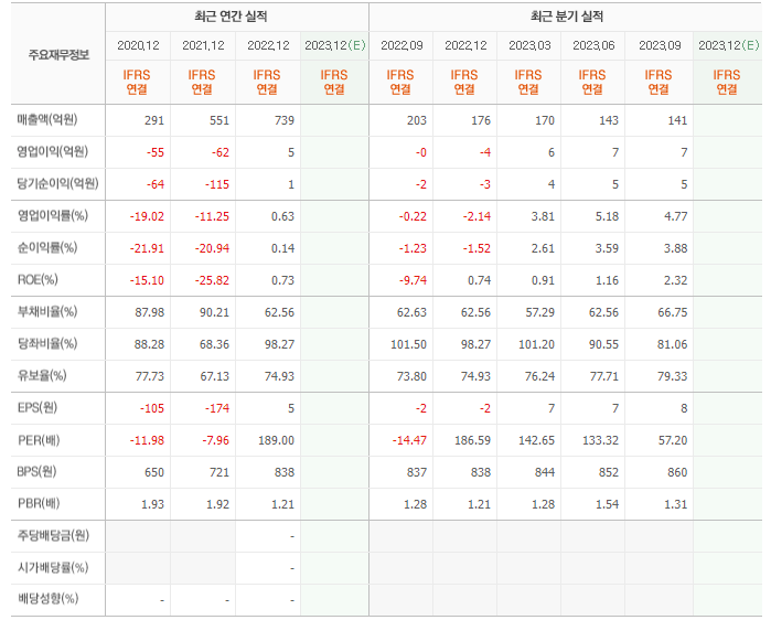 2022년 매출은 739억, 영업이익은 5억, 당기순이익은 1억입니다. 그리고 영업이익률은 0.63%입니다.