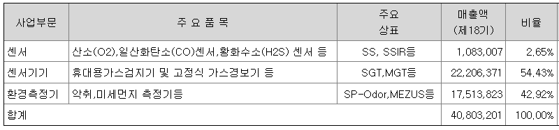당사는 센서 및 모듈, 센서기기, 환경 측정기사업을 영위하고 있으며, 2개의 비상장 종속기업으로 구성된 다양한 산업현장의 가스 관련 안전과 문제점 해결을 위한 솔루션을 제시할 수 있는 국내 유일의 센서 기술 기반 전문 기업입니다.