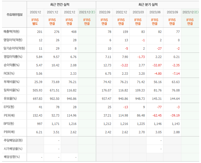 2022년 매출은 408억, 영업이익은 28억, 당기순이익은 8억입니다. 그리고 영업이익률은 6.76%입니다.