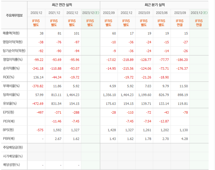 2022년 매출은 101억, 영업이익은 -97억, 당기순이익은 -94억입니다. 그리고 영업이익률은 -95.96%입니다.