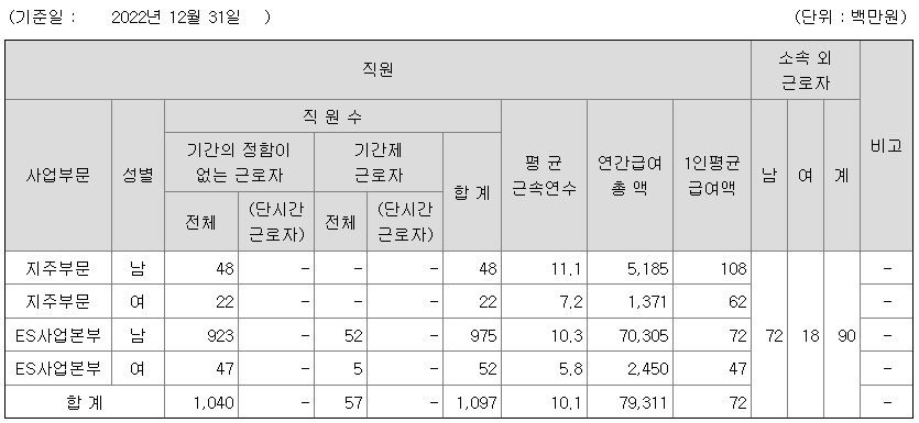 | 사업부문 | 성별 | 직원수 | 평균근속연수 | 평균연봉(백만) |