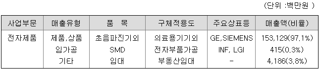 당사는 전자제품 생산 전문회사로 모든 전자제품을 생산, 판매하고 있으며 각 매출 유형별 매출액 및 비율은 다음과 같습니다.
