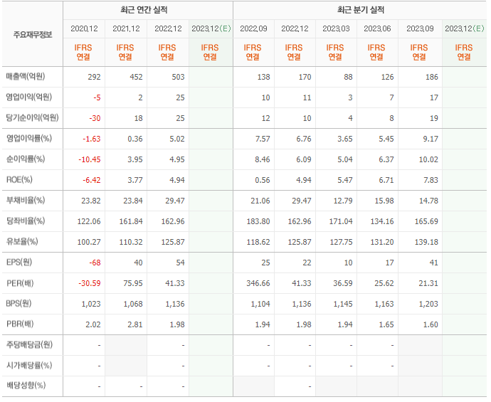 2022년 매출은 503억, 영업이익은 25억, 당기순이익은 25억입니다. 그리고 영업이익률은 5.02%입니다.