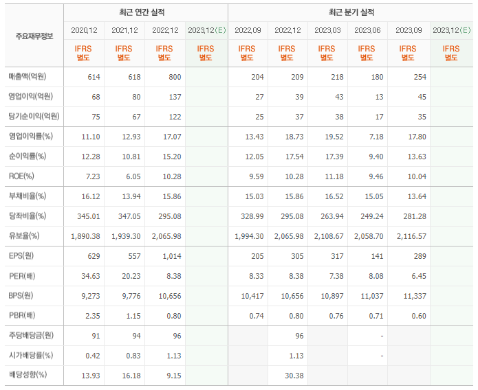 2022년 매출은 800억, 영업이익은 137억, 당기순이익은 122억입니다. 그리고 영업이익률은 17.07%입니다.