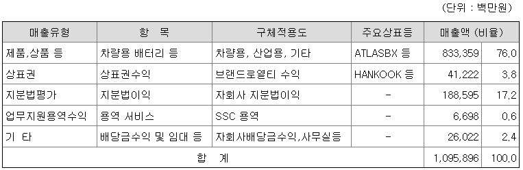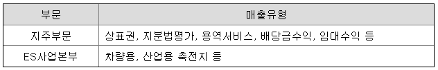 당사의 매출은 경영자문 용역매출, 임대사업수익, 상표권사용수익, 지분법이익의 매출이 발생하는 지주부문과 축전지 제품 매출이 발생하는 ES사업본부로 구성되어 있습니다.
