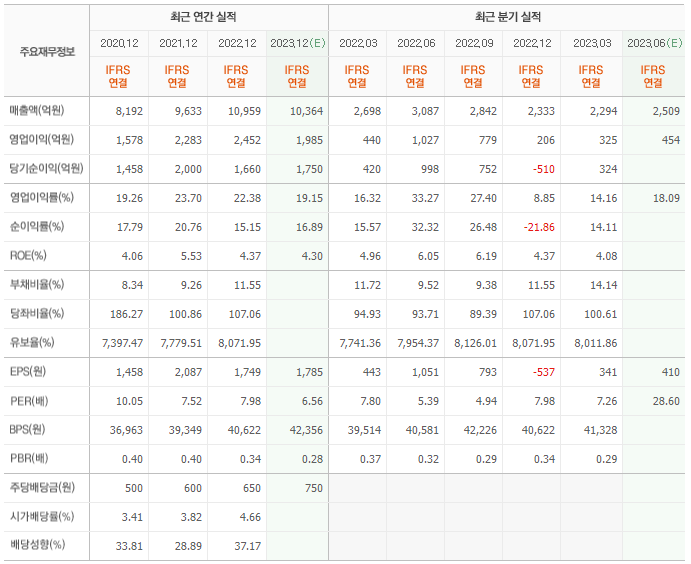 2022년 실적은 1조 959억, 영업이익은 2452억입니다. 그리고 영업이익률은 6.40%입니다.
