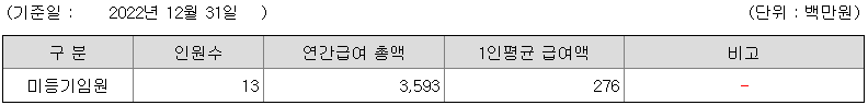미등기임원의 평균연봉은 2억 7600만원이고 직원수는 13명입니다.