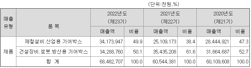 당사는 제철.에너지.건설.운반하역.플랜트 등에 적용되는 제철설비/산업용 기어박스와 중장비용 기어박스, 정밀감속기 등 기어박스와 대형정밀기어 등을 생산.판매하고 있으면 품목별 매출 현황은 다음과 같습니다.