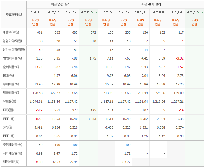 2022년 매출은 683억, 영업이익은 54억, 당기순이익은 51억입니다. 그리고 영업이익률은 7.88%입니다.