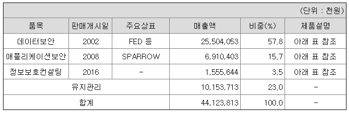 당사는 지식정보보안산업의 콘텐츠/정보유출방지보안 분야의 데이터보안사업과, 소프트웨어 품질과 보안을 테스트하고 결함 등을 찾아주는 애플리케이션보안 분야 사업, 그리고 기업의 정보 보안 취약점 및 보안 체계에 대한 컨설팅을 제공하는 정보보호컨설팅 사업, 문서의 공유와 관리/통합 기능을 제공하는 엔터프라이즈 문서 플랫폼 사업과 기업 외부와도 협업을 가능하게 하는 외부 협업 플랫폼, 빅데이터를 활용한 개인정보 비식별화 솔루션을 제공하는 개인정보 비식별화 사업을 영위하고 있습니다.