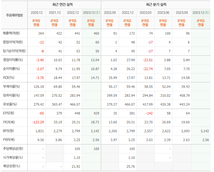 2022년 매출은 441억, 영업이익은 52억, 당기순이익은 53억입니다. 그리고 영업이익률은 11.78%입니다.