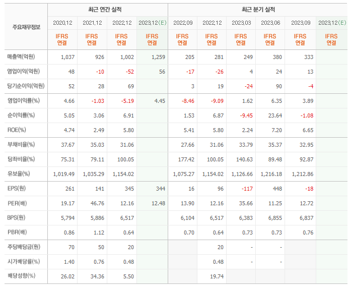 2022년 매출은 1002억, 영업이익은 -52억, 당기순이익은 69억입니다. 그리고 영업이익률은 -5.19%입니다.