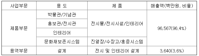 당사는 전시문화시설 및 인테리어시설을 제작 설치하는 제품매출 부문과 전시문화시설 및 인테리어 시설을 설계하는 용역설계 부문으로 크게 구분하고 있으며, 각 부문별 매출액 및 매출액에서 차지하는 비율은 다음과 같습니다.