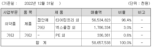 당사는 점안제 및 안과용제 제조 전문기업으로 무방부제 점안제와 함께 안구건조증, 녹내장, 항염증 등 안과질환 치료제를 개발하고 있습니다. 점안제의 경우  연간 매출액의 96.4%를 차지하고 있으며 대표 제품인 티어린프리, 티어린피점안액 등이 의약품 도매상으로 판매되고 있습니다. 자사제품을 비롯해 하메론점안액 등 수탁제품 매출까지 당사는 국내 일회용점안제시장에서 선도기업의 지위를 유지하고 있습니다.