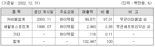 당사는 1998년에 설립된 주사제용 항생제 원료의약품(API) 전문제약기업으로, 카바페넴계 항생제 원료의약품을 중점적으로 생산하고 있습니다. 당사 주력 매출 품목은 카바페넴계열 항생제 이미페넴과 에르타페넴으로서 세팔로스포린계 항생제나 기타 항생제에 비하여 항균력이 탁월하여 높은 가격이 형성되어 있는 품목입니다.