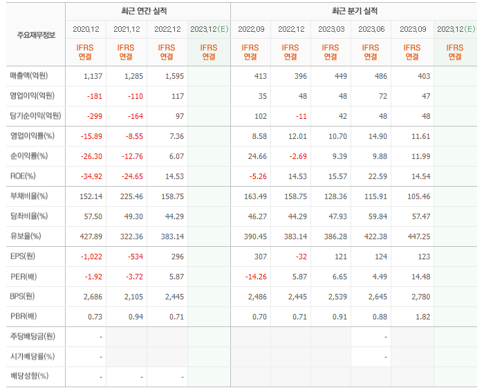 2022년 매출은 1595억, 영업이익은 117억, 당기순이익은 97억입니다. 그리고 영업이익률은 7.36%입니다.