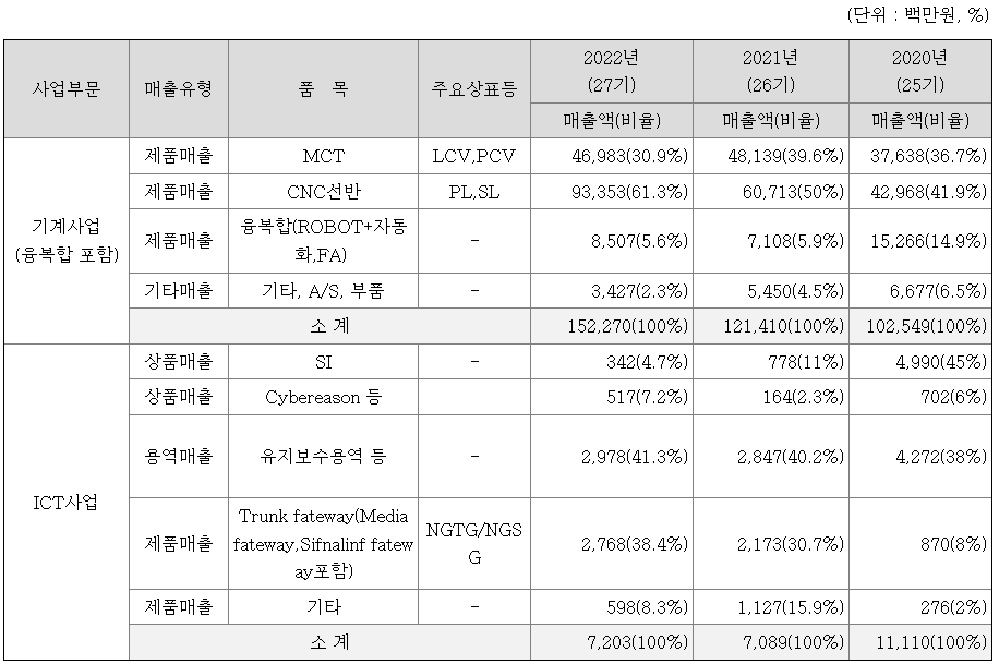 또한, 당사는 2011년 2월 1일(합병기준일) 합병으로 인해 상기 통신사업외에 기계사업(공작기계 제조 및 판매, 산업용로봇의 제조 및 판매업)을 추가로 영위하게 되었습니다.