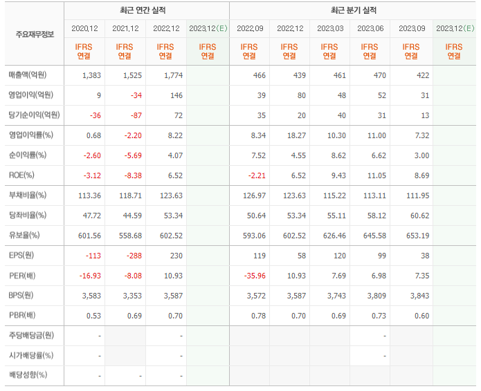 2022년 매출은 1774억, 영업이익은 146억, 당기순이익은 72억입니다. 그리고 영업이익률은 8.22%입니다.