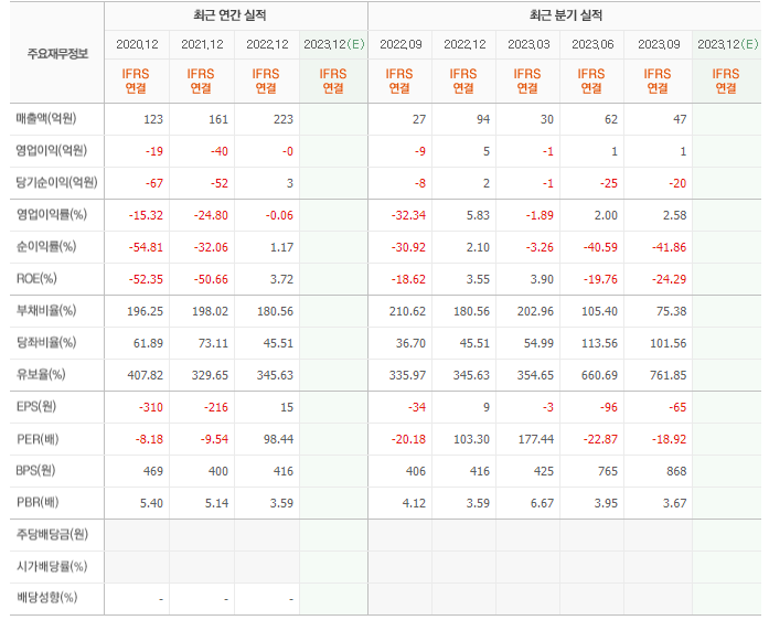2022년 매출은 233억, 영업이익은 -0억, 당기순이익은 3억입니다. 그리고 영업이익률은 -0.06%입니다.