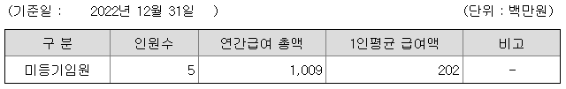 미등기임원의 평균연봉은 2억 200만원이고 직원수는 5명입니다.