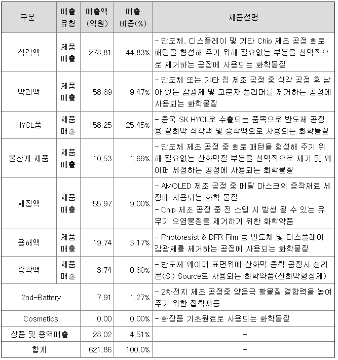 당사는 IT기초 화학약품을 공급하는 업체로써, 반도체 분야 화학약품 제조를 기반으로 성장 해왔습니다. 이후 반도체를 시작으로 디스플레이, LCD, OLED, 2차전지, 태양전지 분야 화학 약품 공급으로 사업을 확장해 왔으며, 당사의 연구소를 주축으로 고객 맞춤형 제품개발까지 사업을 넓혀가고 있으며, 현재 세계의 흐름에 큰 역할을 하고 있는 SK하이닉스 및 삼성SDI 등을 비롯하여 주요 고객사등에 공급을 하고 있습니다.