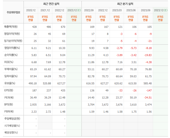 2022년 매출은 670억, 영업이익은 69억, 당기순이익은 61억입니다. 그리고 영업이익률은 10.30%입니다.