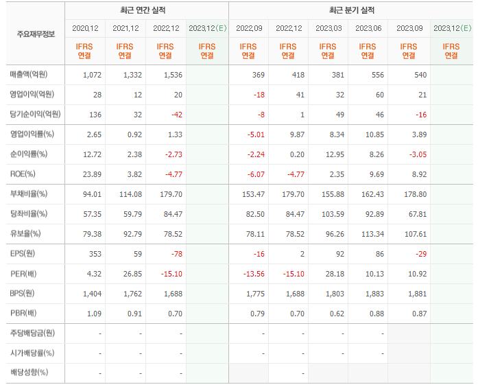 2022년 매출은 1536억, 영업이익은 20억, 당기순이익은 -42억입니다. 그리고 영업이익률은 1.33%입니다.