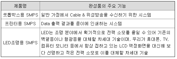 당사는 AC용 전류를 일반 가정에서 사용하는 DC용 전류로 전환시키는 역할과 화재 및 감전 위험으로부터 전자 제품 사용자를 보호하는 역할을 하고, 사용 전력의 최소화를 위해 사용되는 전원 공급 장치(PSU)와 전기/전자 완제품 수동 회로 구성의 핵심부품인 FILM CAPACITOR의 제조, 판매를 주요 사업으로 영위하고 있습니다.