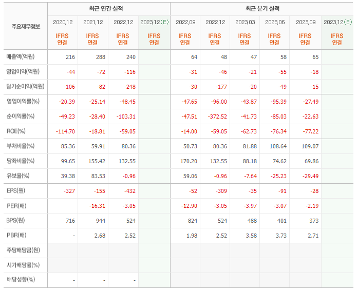 2022년 매출은 240억, 영업이익은 -116억, 당기순이익은 -248억입니다. 그리고 영업이익률은 -48.45%입니다.