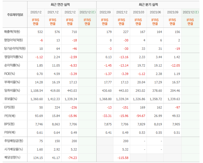 2022년 매출은 710억, 영업이익은 -18억, 당기순이익은 -46억입니다. 그리고 영업이익률은 -2.59%입니다.