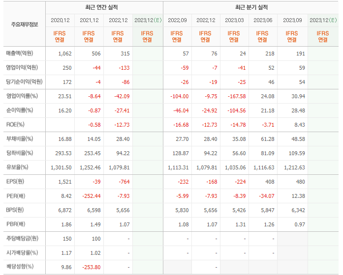 2022년 매출은 315억, 영업이익은 -133억, 당기순이익은 -86억입니다. 그리고 영업이익률은 -42.09%입니다.
