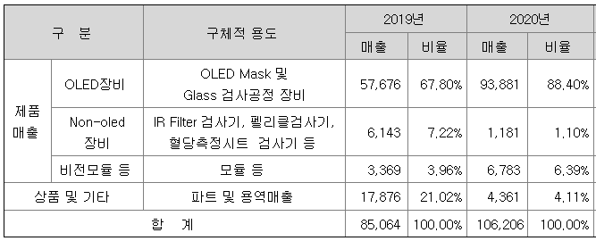 당사는 글로벌 디스플레이 패널업체에 OLED 핵심공정인 유기물 증착 공정 관련된 모바일용 분할 메탈 Mask 연관 장비를 개발 및 공급하고 있습니다. OLED장비 이외에도 스마트폰 카메라용 블루필터 검사기, 반도체 관련 펠리클 검사기, 헬스케어 관련 혈당측정기 검사기 등의 장비를 제조하여 관련업체에 판매하고 있으며, 장비에 필요한 각종 모듈도 제조하여 판매 중입니다.