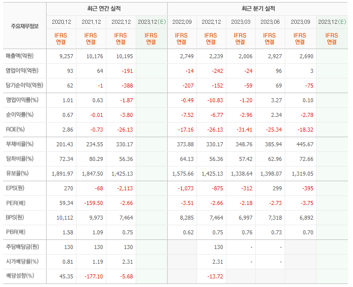 2022년 매출은 1조 195억, 영업이익은 -191억, 당기순이익은 -388억입니다. 그리고 영업이익률은 -1.87%입니다.